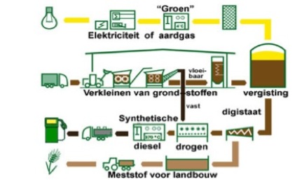 De onderste helft toont hoe de biomassa na verkleining wordt gedroogd en vervolgens tot poeder vermalen met een deeltjesgrootte van 0,2 mm om in de TPT-installatie te worden omgezet in hoogwaardige synthetische diesel. De installatie produceert uit circa één ton biomassa met circa 12% vochtgehalte, circa 400 liter hoogwaardige synthetische diesel.